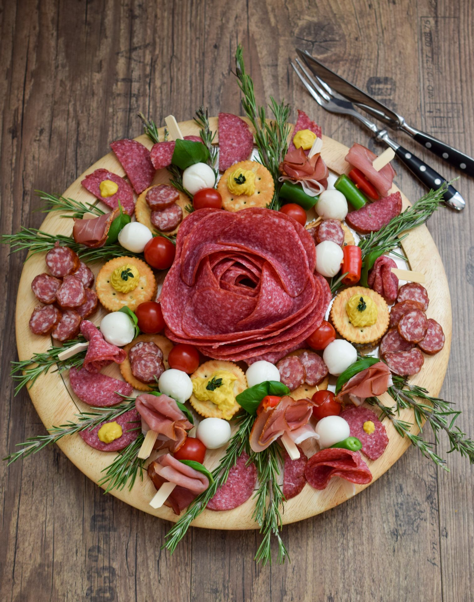 2. Bei zwei Scheiben Salami ein Dreieck ausschneiden und die Salamischeiben auf das
